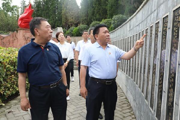 渭华起义烈士纪念碑前松柏掩映,苍翠挺拔。党员干部面向纪念碑庄严肃立,党员代表向革命烈士敬献花篮,党组成员、副局长任科志迈步上前,仔细整理花篮缎带。全体同志默哀,向革命先烈三鞠躬。