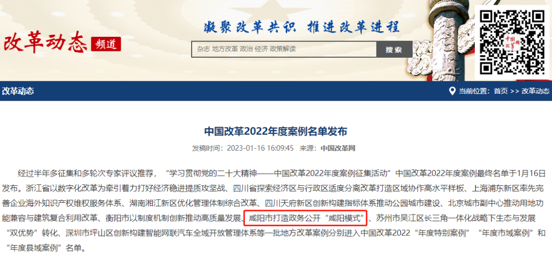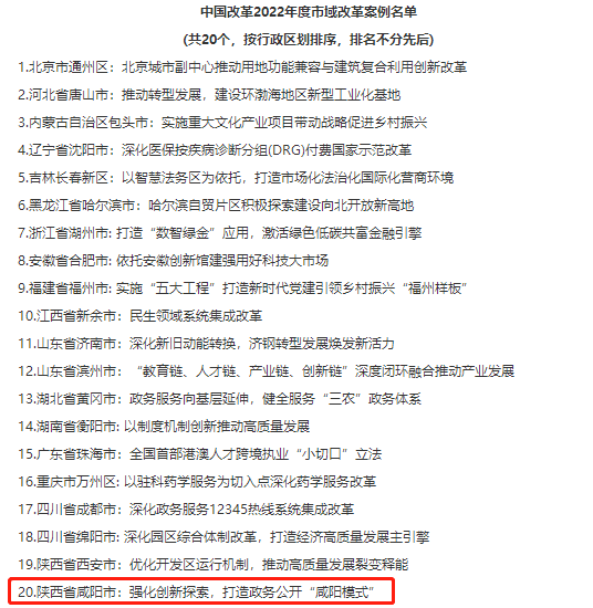 近日,中国改革2022年度案例名单公布,咸阳市《强化创新探索,打造bet3365标准版_365bet足球_365登录平台公开“咸阳模式”》成功入选“中国改革2022年度市域改革案例”。此案例从全国30个省(直辖市、自治区)334个地级市2000个案例中层层筛选,前期成功入选200个“中国改革2022年度地方全面深化改革典型案例”,后经权威评审再获殊荣。