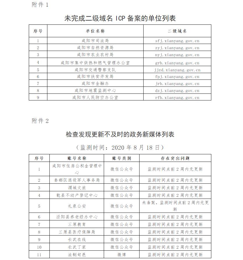 (一)部分单位未进行二级域名ICP备案。7 月27日,咸阳市大数据管理局印发了《关于做好网站二级域名ICP备案工作的紧急通知》,明确了备案范围,说明备案流程,并要求各单位限期完成二级域名ICP备案工作。我市使用本级政府网站二级域名的部门共计42家,截止8月14日,已完成二级域名ICP备案的单位共计32家,仍有9家未完成ICP备案。(详情见附件1)